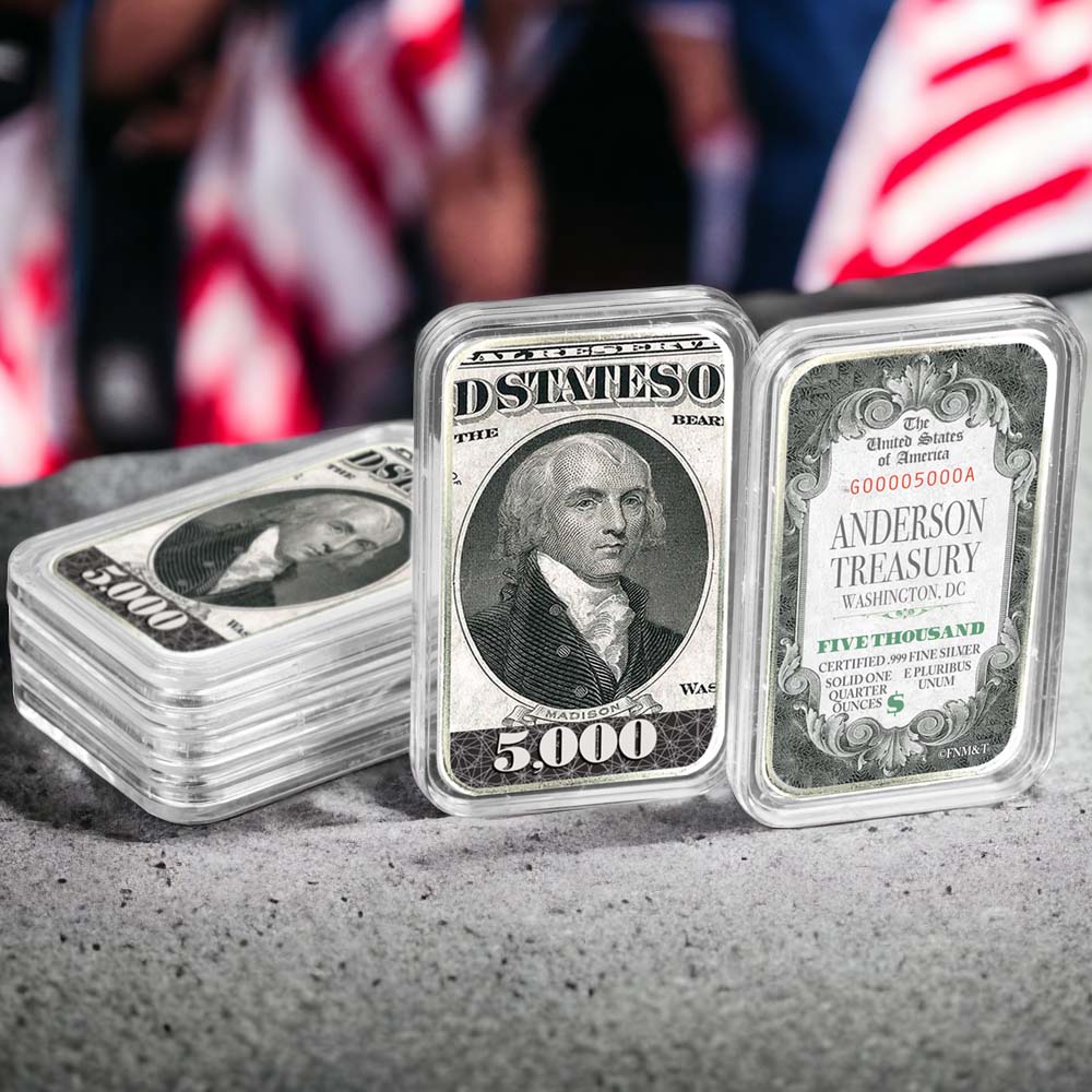 Your name, permanently inscribed onto 5 of the highest-denomination, one full quarter ounce certified .999 pure silver bars ever minted and delivered to you in a FREE Armored Bank Safe.