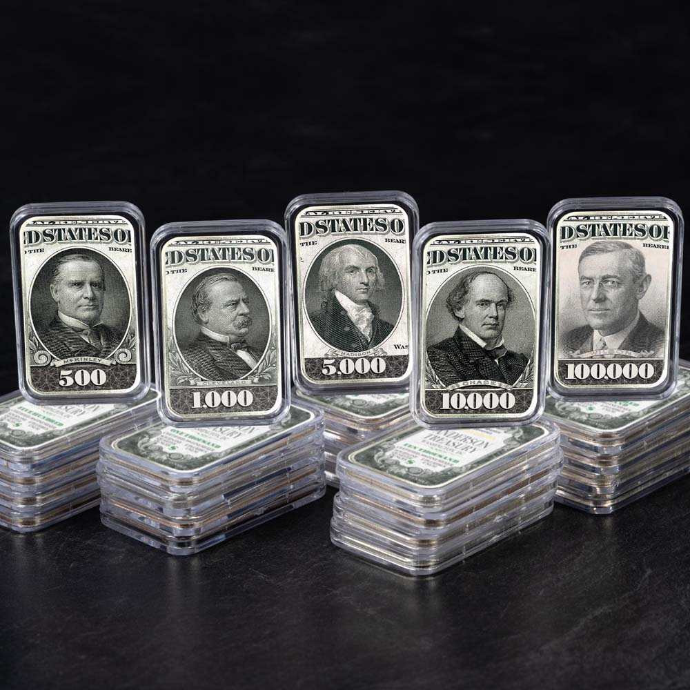 5 Personalized High Denomination Silver Bars that weigh One Full Quarter Ounce each. This rare collection goes beyond mere plain silver bullion to become a true reflection of who you are. It’s an heirloom that speaks your family name, a one-of-a-kind masterpiece destined to become the centerpiece of your family’s legacy.