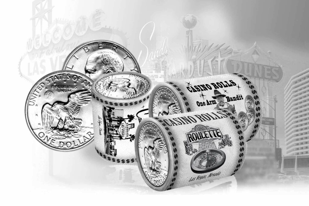 Old Vegas “Casino Rolls”, filled with historic American Eagle Ike Large Dollar Coins from 1976 and earlier like the ones that were once used decades ago in the slot machine in the world famous casinos. Just holding one of these Old Vegas “Casino Rolls” reminds you of walking down the Vegas Strip in the glory days of that hopeful, luck-charged era.