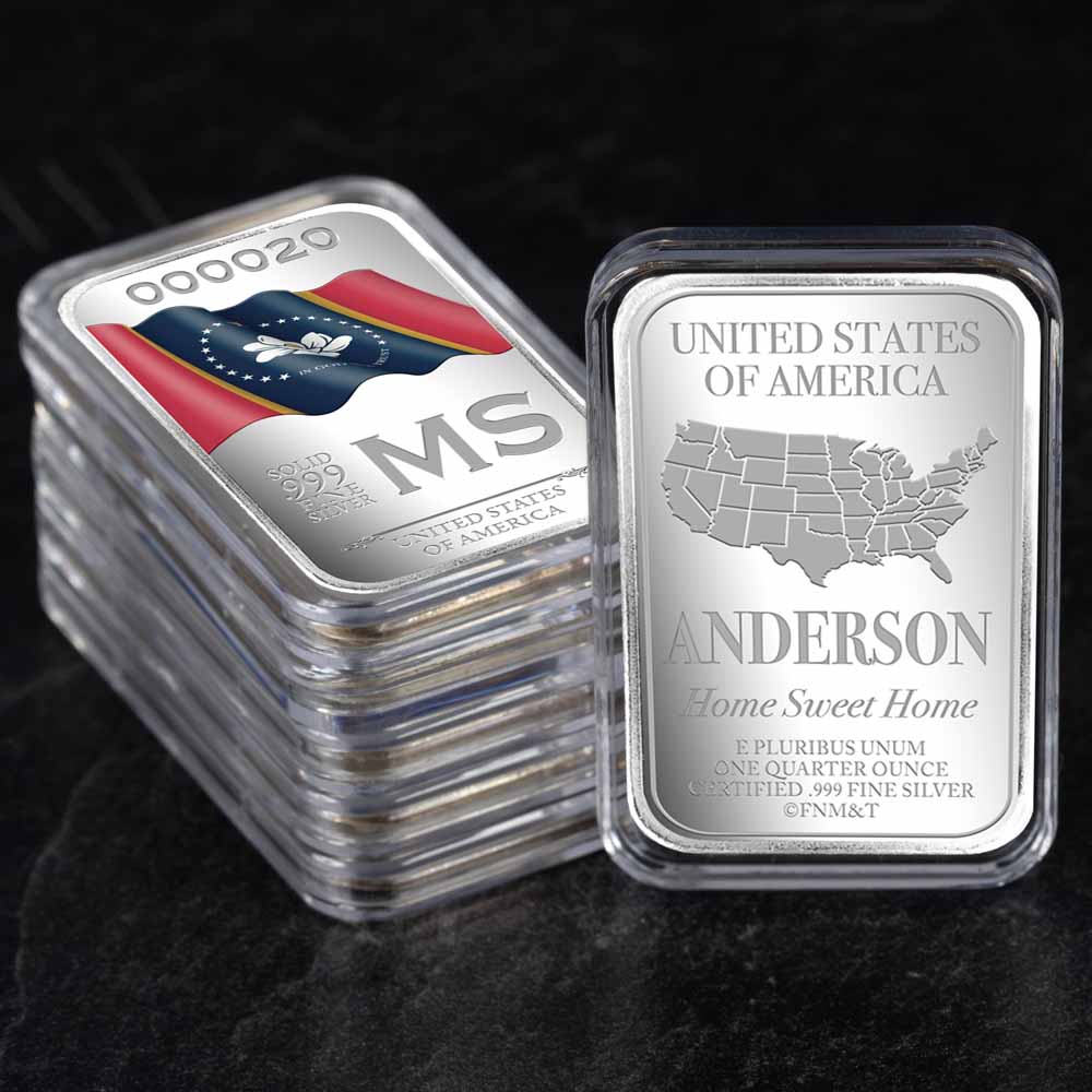 Each bar offers a glimpse into the artistic mastery and heritage of past eras. Every State Silver Bar is Personalized with your Last Name, marking your pride in your home state. Each bar is encapsulated to ensure the lasting preservation of these historic treasures for years to come.