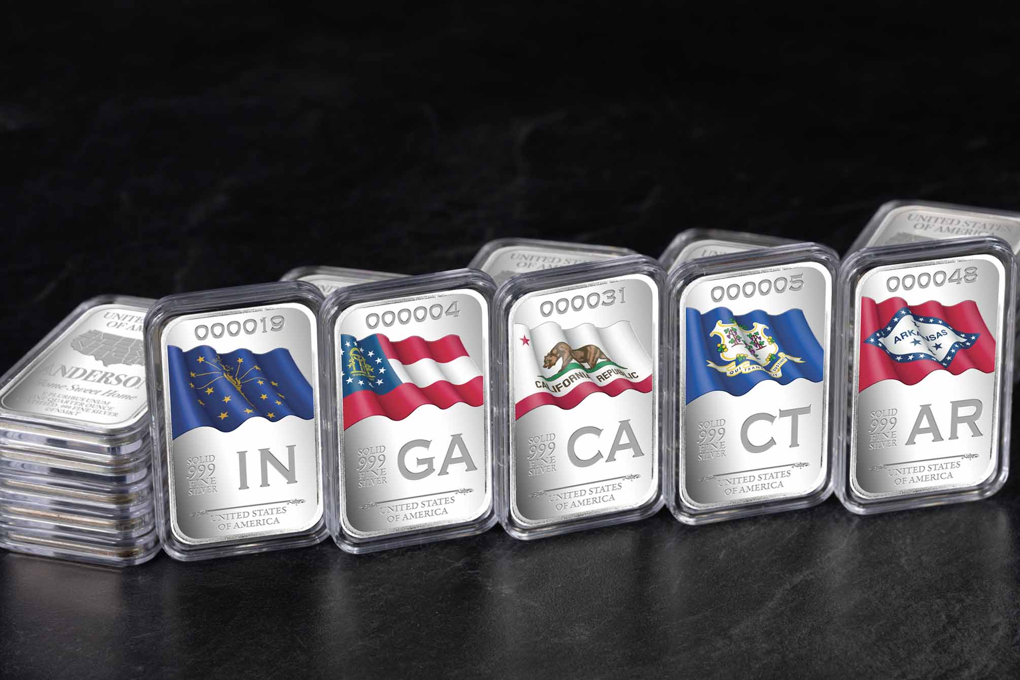 An American Republic in Color – crafted into .999 Fine Silver. Meticulously detailed and precision-minted One Quarter-Ounce Fine Silver bars, offering both aesthetic and tangible value to seasoned and budding numismatists alike. A glimpse into history and heritage, capturing the essence of each States’ illustrious legacy in precious silver.