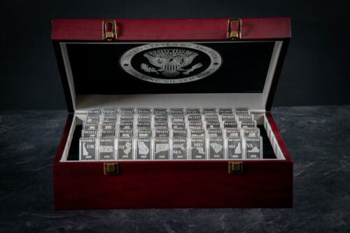 Own a Patriotic piece of America. Sculpted from .999 fine silver, this 50 state silver bars collection is a tangible testament to our nation’s heritage. Perfect for seasoned numismatists, this collections stands as radiant markers of America’s rich timeline. Display them, and let history speak.